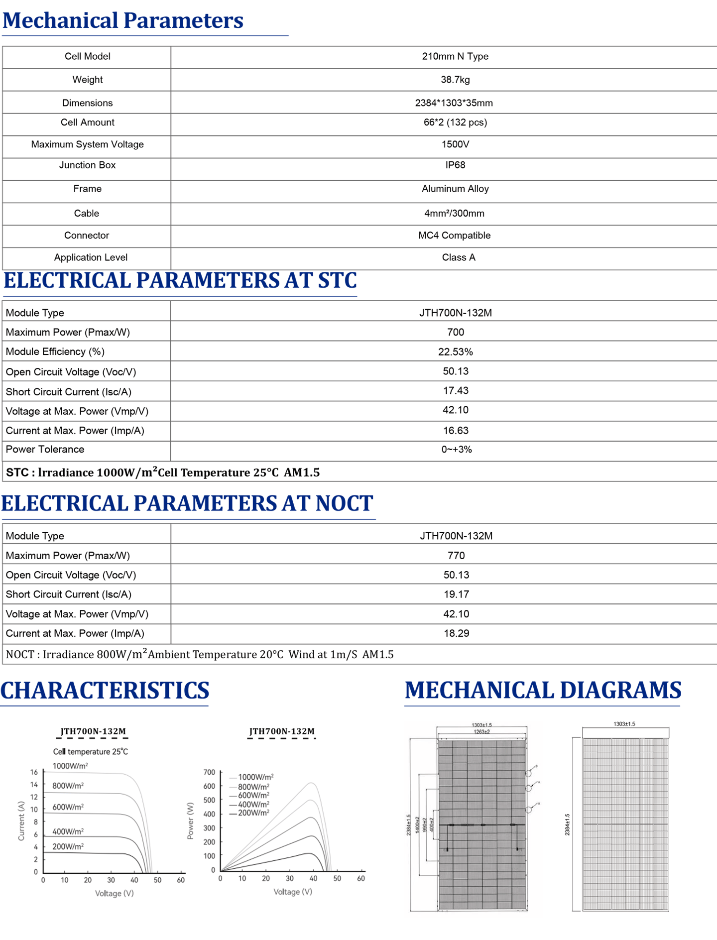 The JTH700W represents the pinnacle of modern solar engineering. Built with larger 210mm N-Type TOPCon bifacial cells, this panel is designed for one purpose: to deliver the lowest Levelized Cost of Energy (LCOE) for utility-scale solar plants and large commercial installations. Its immense power output, combined with exceptional bifacial gains and superior performance in real-world conditions, makes it the most powerful and economically advantageous panel in our lineup, setting a new standard for solar project development.