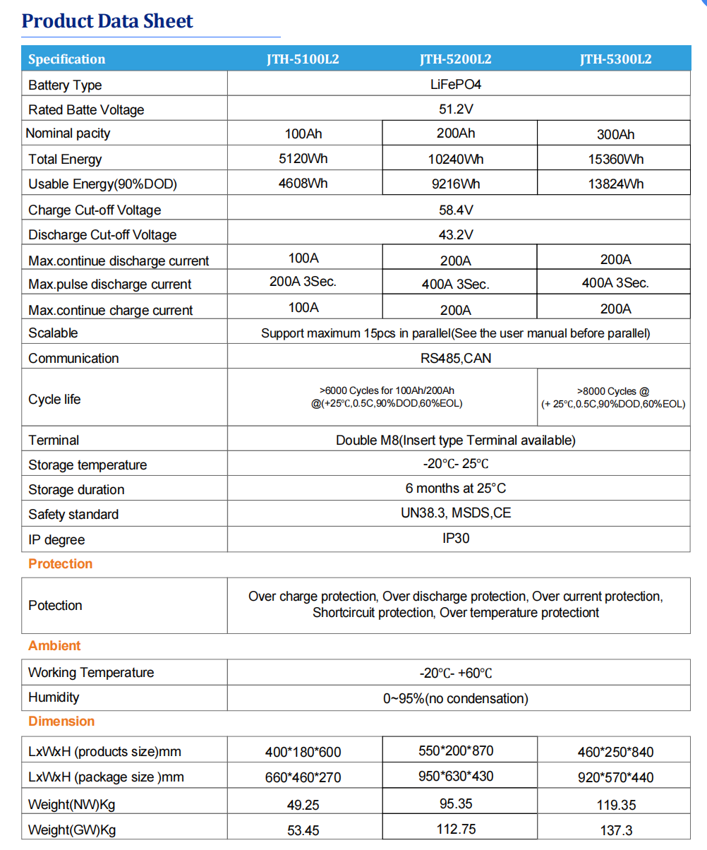 The JTH-5100L2, 5200L2, and 5300L2 series represent our high-voltage, high-capacity energy storage solutions. Operating at 51.2V, these batteries are engineered for larger residential systems and commercial applications where reliability, scalability, and performance are paramount. With capacities from 5.1kWh to 15.4kWh per unit and exceptional cycle life, they form the foundation of robust solar-plus-storage systems.